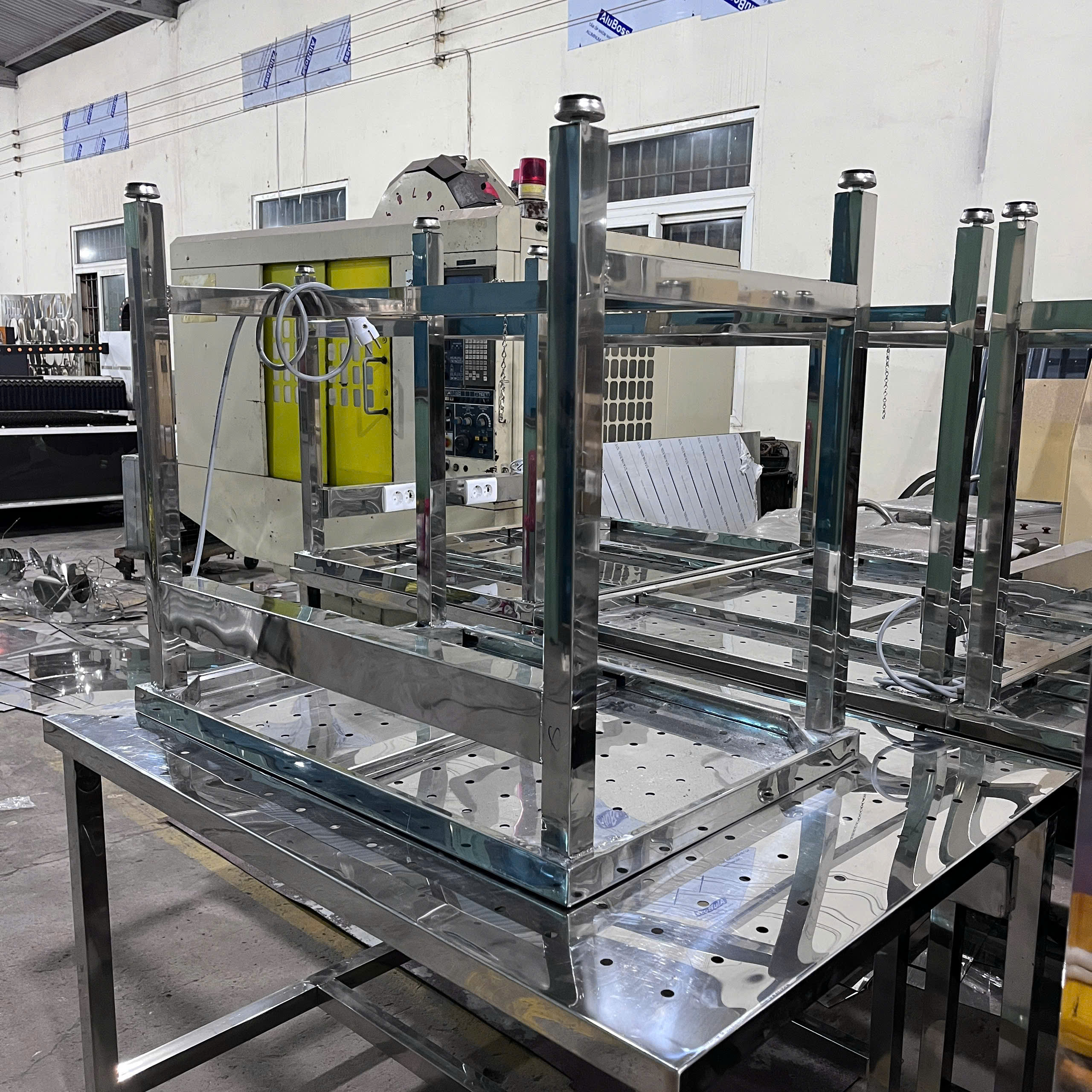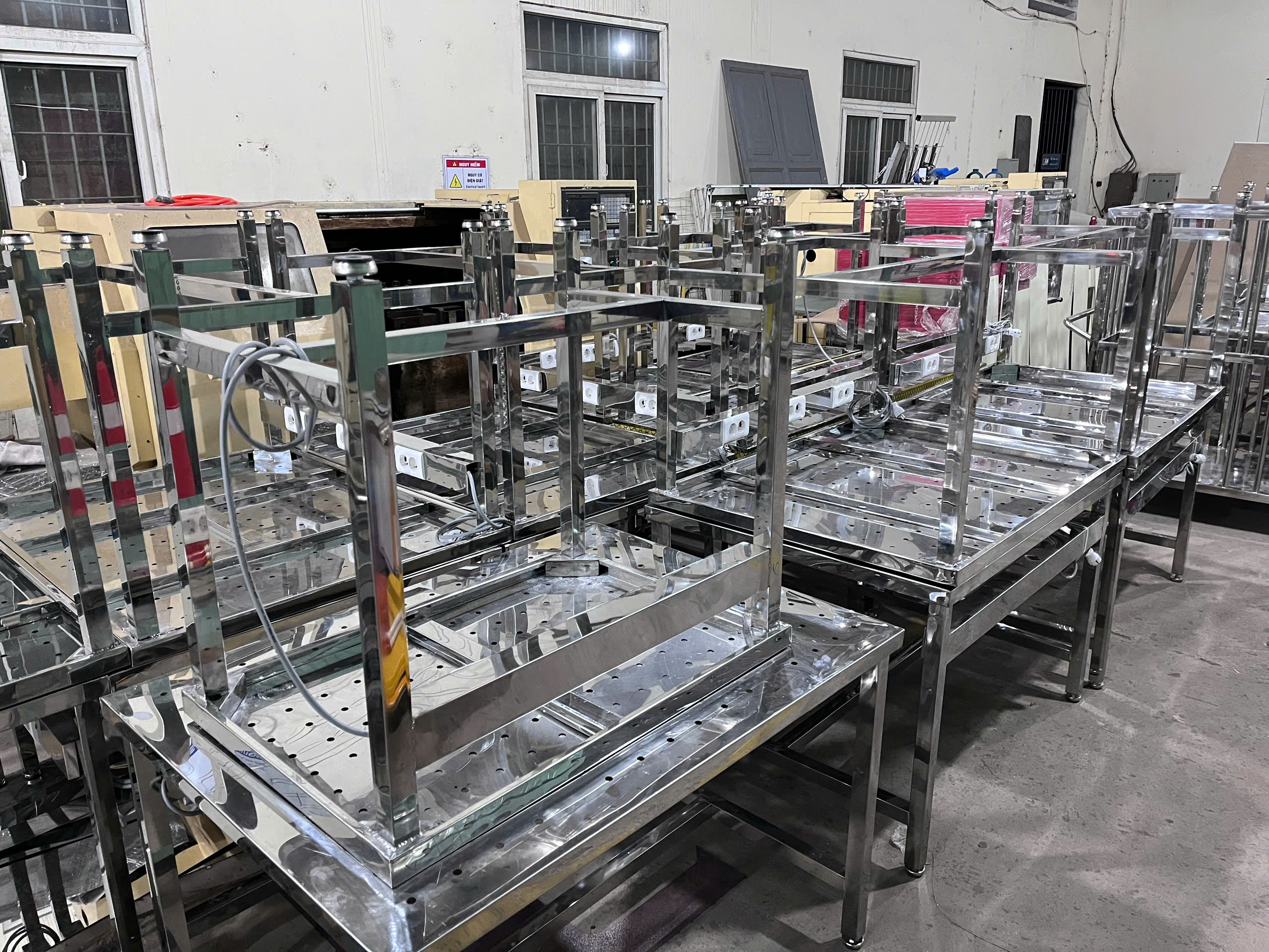 Khung bàn: Gia công từ ống hoặc hộp inox, được hàn chắc chắn, chịu lực tốt. Bề mặt khung được đánh bóng giúp tăng tính thẩm mỹ và chống gỉ sét.