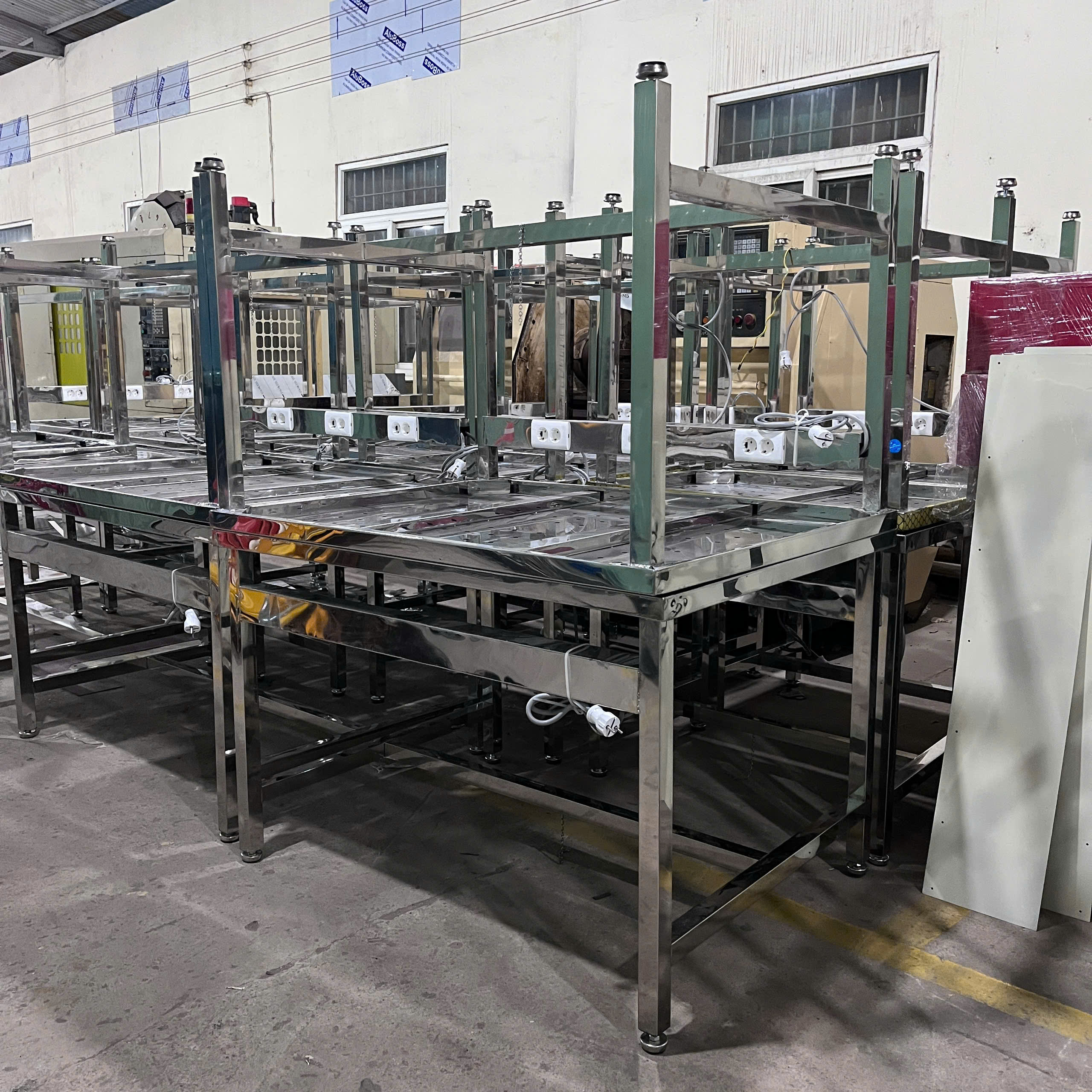 Chân bàn: Gồm 4 chân inox chắc chắn, có thể điều chỉnh độ cao bằng đế cao su hoặc tăng-đơ ren. Đế cao su chống trượt, giảm rung khi làm việc.